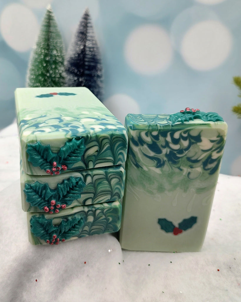 This festive soap is adorned and embedded with holly leaves and berries. It is scented with cranberry fig, which offers notes of cranberry, fig, blood orange, and pink grapefruit. It is filled with skin loving oils to nourish your skin and also raw mulberry silk for an extra luxurious bar.